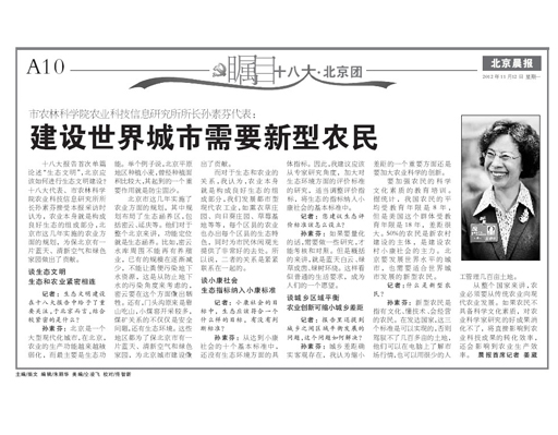 十八大報告首次單篇論述“生態文明”,北京應該如何進行生態文明建設?十八大代表、市農林科學院農業科技信息研究所所長孫素芬接受本報采訪時認為,農業本身就是構成良好生態的組成部分,北京市這幾年實施的農業方面的規劃,為保北京有一片藍天、清新空氣和綠色家園做出了貢獻。
