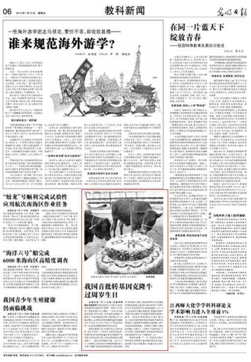 本報(bào)北京7月11日電(記者鄧暉 通訊員張麗萍)我國(guó)首批轉(zhuǎn)入大理石花紋狀肉質(zhì)基因的克隆肉牛“萌萌”、“妞妞”10日吃到了美味的周歲生日蛋糕。“一年來,兩頭轉(zhuǎn)基因克隆牛茁壯成長(zhǎng),經(jīng)權(quán)威機(jī)構(gòu)檢測(cè),外源的A-FABP基因成功轉(zhuǎn)入基因組之中,并穩(wěn)定整合,這表明這項(xiàng)體細(xì)胞轉(zhuǎn)基因克隆技術(shù)生產(chǎn)體系可以用于安全生產(chǎn)轉(zhuǎn)基因動(dòng)物。”北京農(nóng)學(xué)院教授倪和民告訴記者。