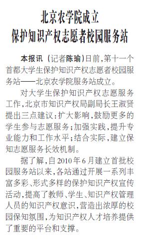 本報訊 (記者陳瑜)日前,第十一個首都大學生保護知識產(chǎn)權(quán)志愿者校園服務站——北京農(nóng)學院服務站成立。