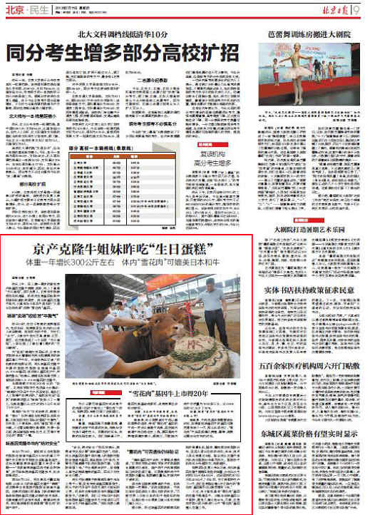 昨天上午,馬上滿一周歲的首批京產轉基因克隆牛萌萌、妞妞,吃上了青草“生日蛋糕”。項目負責人、北京農學院教授倪和民透露,經兩次血液基因檢測并經國際權威機構測定,兩頭轉基因克隆牛體內,已具有與日本和牛類似的“大理石花紋肉質”(俗稱“雪花肉”)基因。