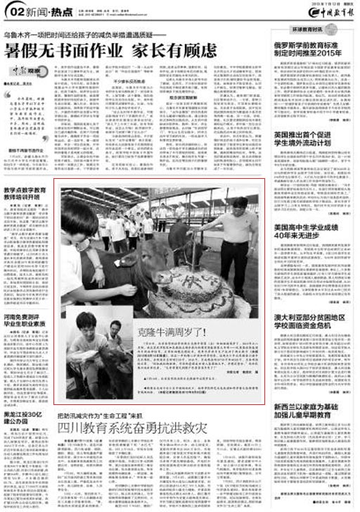 7月10日,北京農學院培育的兩頭克隆牛萌萌(左)和妞妞滿周歲了。2012年七八月間,由北京農學院倪和民教授主持并執行的國家轉基因重大專項——優質高效轉基因肉牛新品種培育,應用體細胞克隆技術,使用代孕母牛生產成活了兩頭犢牛(本報2012年8月14日報道)。經過一年的精心護理和科學飼養,這兩頭小牛比同齡秦川犢牛生長得快,分別由出生時的21公斤、50公斤,長成現在的307公斤和403公斤,且各項指標正常。“經權威機構檢測,外源的基因成功轉入基因組之中,并穩定整合。”倪和民高興地告訴記者,“大家有望吃到國產優質雪花牛肉了!”