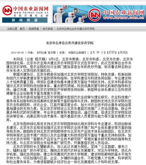 北京市農委將加強對北京農學院都市型現代農業政策與理論研究、農業科技推廣服務體系創新和科技成果轉化機制等方面的指導與支持。鼓勵和支持北京農學院與在京農業科研院所、涉農企業、區縣開展深度合作,加大對農業技術綜合服務試驗站等基地建設的支持力度;在北京農學院設立北京市基層農技推廣人員培訓基地,聯合開展多種形式的學歷教育、專業學位教育和專題培訓。通過共建,促進北京農學院在政府決策咨詢、成果應用與技術服務、提升基層農技人員素質與能力等方面發揮更大作用。