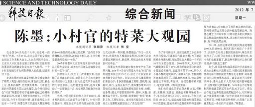 如今,育苗基地和蔬菜新品種示范基地又成為農業科技示范展示區,村民們經常要到陳墨的連棟大棚和溫室大棚里走走看看,向陳墨咨詢可以種植哪些蔬菜。蔬菜基地不僅幫忙買種子、請專業技術人員向村民傳授種植技術,還幫助村民銷售蔬菜。2011年合作社幫助村民銷售蔬菜西瓜等農產品25萬公斤。現在合作社正在籌劃建設蔬菜配送中心,切實解決農戶賣菜難的問題。“合作社將逐步形成蔬菜瓜果育苗、種植和新品種科研、示范推廣以及蔬菜配送一條龍的產業鏈條。”陳墨說。