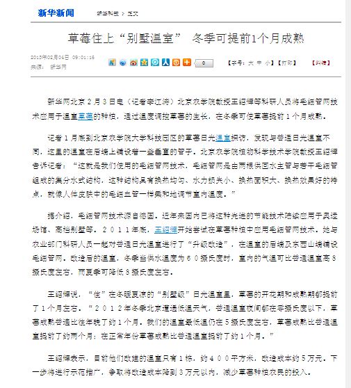 新華網北京2月3日電(記者李江濤)北京農學院教授王紹輝等科研人員將毛細管網技術應用于溫室草莓的種植,通過溫度調控草莓的生長,在冬季可使草莓提前1個月成熟。