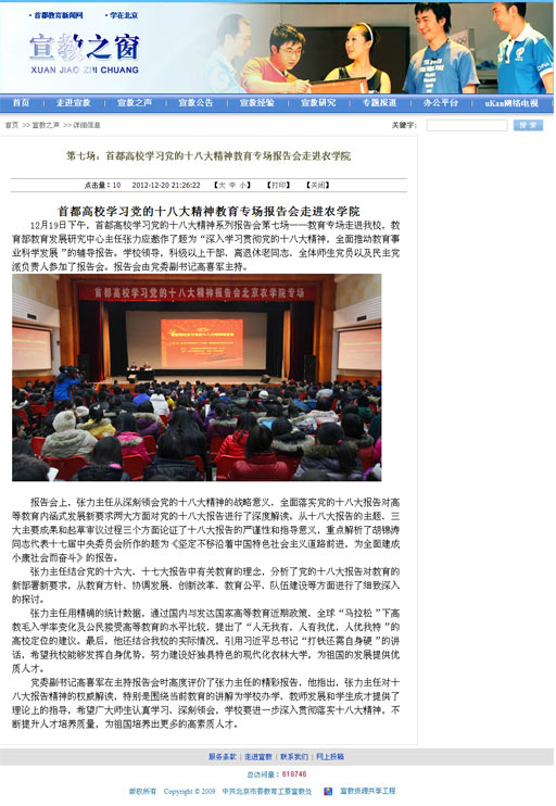 12月19日下午,首都高校學習黨的十八大精神系列報告會第七場——教育專場走進我校,教育部教育發展研究中心主任張力應邀作了題為“深入學習貫徹黨的十八大精神,全面推動教育事業科學發展”的輔導報告。學校領導,科級以上干部、離退休老同志、全體師生黨員以及民主黨派負責人參加了報告會。報告會由黨委副書記高喜軍主持。