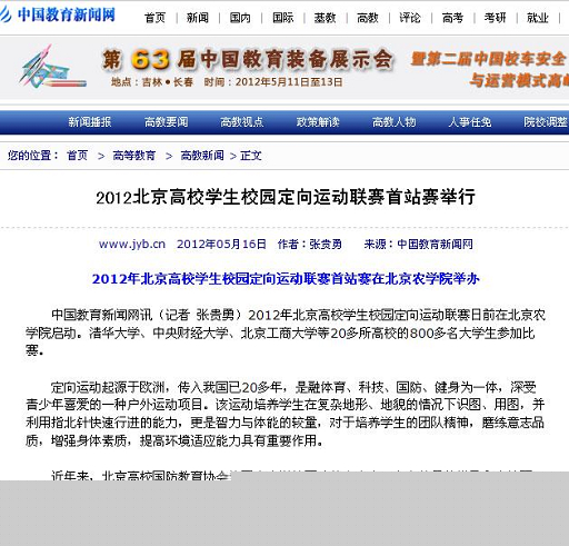 中國教育新聞網(wǎng)訊(記者張貴勇)2012年北京高校學生校園定向運動聯(lián)賽日前在北京農(nóng)學院啟動。清華大學、中央財經(jīng)大學、北京工商大學等20多所高校的800多名大學生參加比賽。
