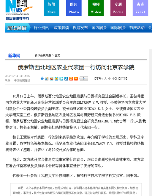 10月17日上午,俄羅斯西北地區(qū)農(nóng)業(yè)地區(qū)發(fā)展與田野研究促進(jìn)會(huì)副理事長(zhǎng)、圣彼得堡國(guó)立農(nóng)業(yè)大學(xué)創(chuàng)新及企業(yè)經(jīng)營(yíng)領(lǐng)域委員會(huì)主席BELYAKOV V.V.教授,圣彼得堡國(guó)立農(nóng)業(yè)大學(xué)創(chuàng)新及企業(yè)經(jīng)營(yíng)領(lǐng)域委員會(huì)副主席、校長(zhǎng)助理VCHINNIKOVA E.I.女士,圣彼得堡國(guó)立農(nóng)業(yè)大學(xué)研究室主任、俄羅斯西北地區(qū)農(nóng)業(yè)地區(qū)發(fā)展與田野研究促進(jìn)會(huì)秘書(shū)長(zhǎng)MININ V.B.教授,俄羅斯西北地區(qū)農(nóng)業(yè)地區(qū)發(fā)展與田野研究促進(jìn)會(huì)研究員MININAT.N女士等一行5人到我校訪問(wèn)。校長(zhǎng)王慧敏、副校長(zhǎng)杜曉林熱情接見(jiàn)了代表團(tuán)一行。