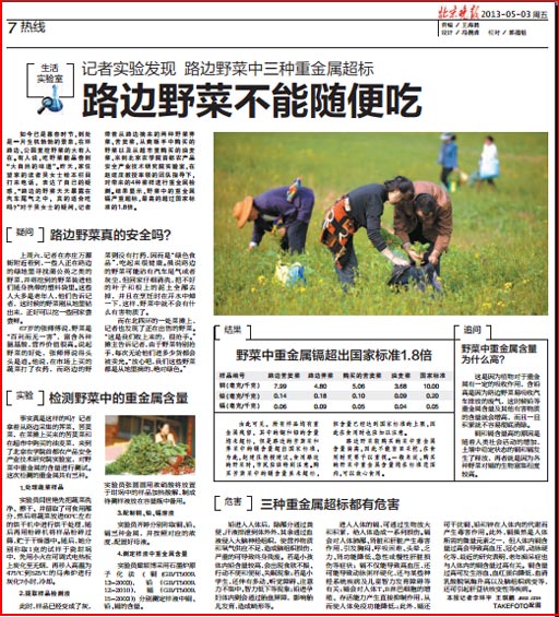 如今已是暮春時節,到處是一片生機勃勃的景象,在環路邊、公園里挖野菜的大有人在。有人說,吃野菜能品嘗到“大自然的味道”。昨天,家住望京的讀者吳女士給本欄目打來電話,表達了自己的疑惑,“路邊的野菜天天暴露在汽車尾氣之中,真的適合吃嗎?”對于吳女士的疑問,記者帶著從路邊摘來的兩種野菜薺菜、苦荬菜,從商販手中購買的野菜以及從超市里購買的油麥菜,來到北京農學院首都農產品安全產業技術研究院實驗室,在趙建莊教授率領的團隊指導下,對帶來的4種菜樣進行重金屬檢測。結果顯示,野菜中的重金屬鎘嚴重超標,最高的超過國家標準的1.8倍。