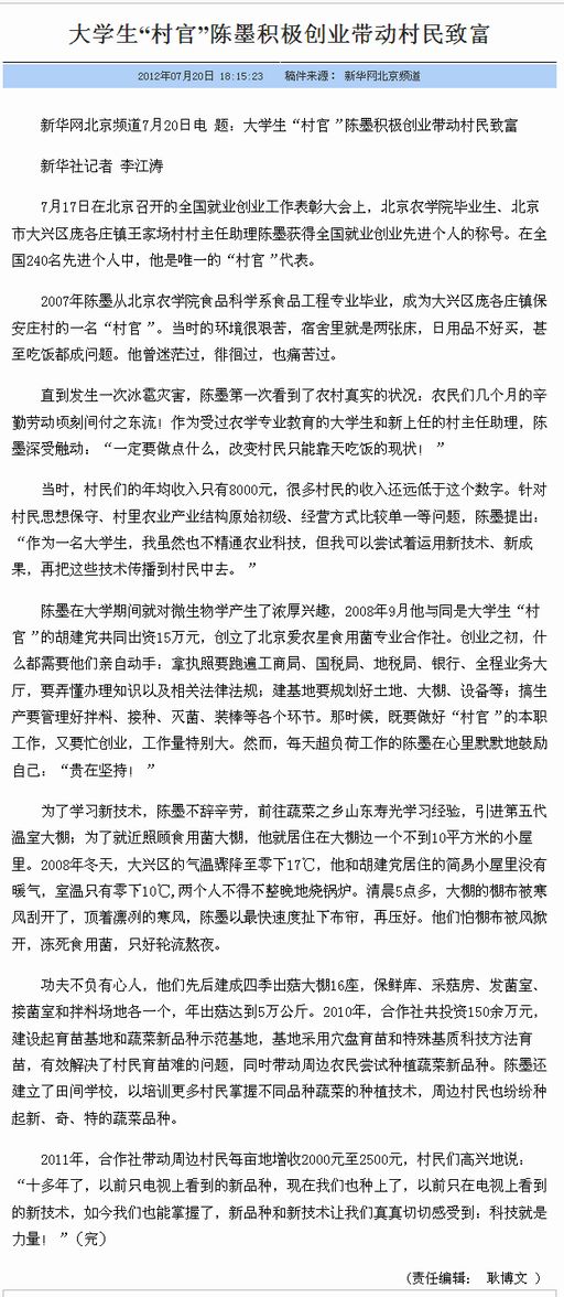 新華網(wǎng)北京頻道7月20日電 題:大學生“村官”陳墨積極創(chuàng)業(yè)帶動村民致富