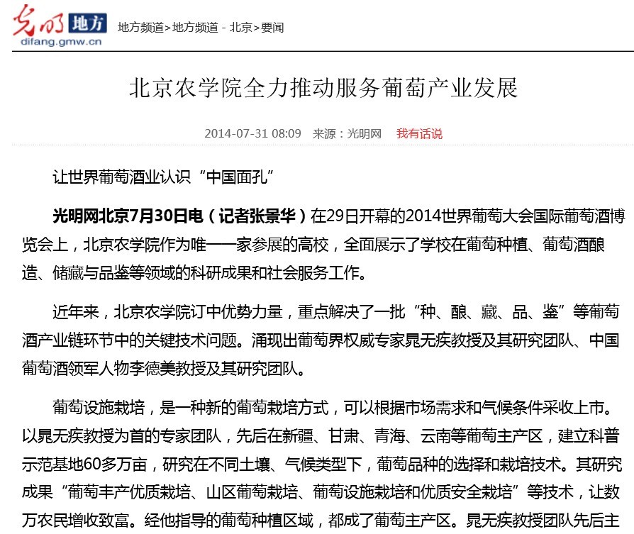 光明網北京7月30日電(記者張景華)在29日開幕的2014世界葡萄大會國際葡萄酒博覽會上,北京農學院作為唯一一家參展的高校,全面展示了學校在葡萄種植、葡萄酒釀造、儲藏與品鑒等領域的科研成果和社會服務工作。