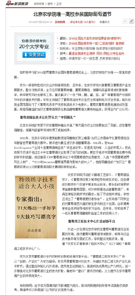 在即將舉行的2014世界葡萄大會國際葡萄酒博覽會上,北京農(nóng)學院作為唯一一家高校參展。