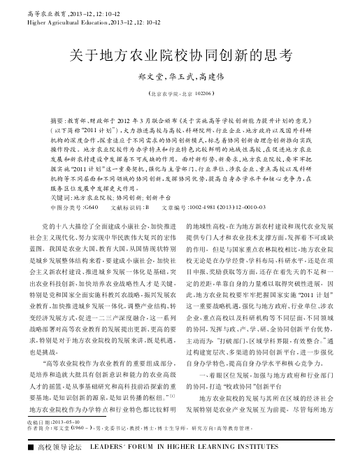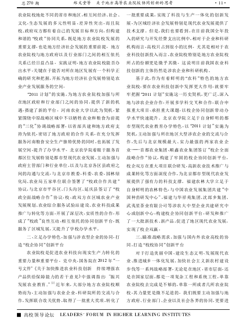 “2011 計劃”的實施,為地方農業院校加強與所在地區政府和行業部門之間的協同,提供了新的機遇,搭建了新的平臺。河南農業大學以此為契機,緊緊圍繞中原戰略區域中不以犧牲農業和糧食為前提的“三化”協調戰略部署,以省部共建和地方政府支持為依托,密切了地方政府的合作關系,在充分發揮服務河南糧食安全生產獨特優勢的同時,也拓展了發展空間,提升了辦學水平。北京農學院著眼于服務首都區位發展特別是都市型現代農業發展,主動加強與政府主管部門和行業單位,以及與北京各區縣政府之間的溝通與交流,與北京市教委、科委、農委、園林綠化局、農業局五家單位聯合簽署了“校政合作共建”協議,與北京市平谷區、門頭溝區、延慶縣簽訂了“校政全面戰略合作”協議,校、政雙方在區域農業產業發展規劃、農業綜合服務試驗站建設、農業科技成果推廣與轉化等方面,開展了深層次、實質性的合作,形成了“校政”良性互動、相互依托的協同創新平臺,既服務了區域發展,又提升了學校辦學水平。