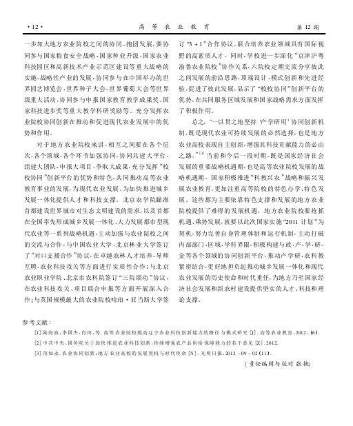 總之,“一以貫之地堅持‘產學研用’協同創新機制,既是現代農業可持續發展的必然選擇,也是地方農業高校表現自主創新,增強其科技貢獻能力的必由之路。”當前和今后一段時期,既是國家經濟社會發展的重要戰略機遇期,也是高等農業院校發展的戰略機遇期。國家積極推進“科教興農”戰略和振興發展農業教育,更加注重高等院校的特色辦學、特色發展。這些都為主要依靠特色支撐和發展的地方農業院校提供了難得的發展機遇。地方農業院校要搶抓機遇、乘勢發展,就要以此次國家實施“2011 計劃”為契機,努力完善自身管理體制和運行機制,主動打破內部部門、區域、學科界限,積極構建與政、產、學、研、金等各個領域的協同創新平臺,推動產學研、農科教緊密結合,更好地擔負起推動城鄉發展一體化和現代農業發展的歷史使命和時代重任,為地方乃至國家經濟社會發展和新農村建設提供堅實的人才、科技和理論支撐。