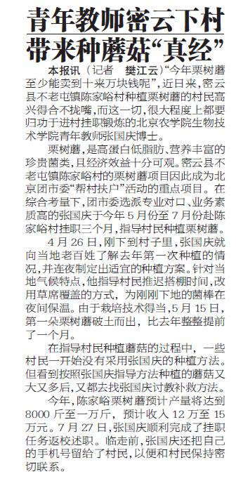 本報(bào)訊“今年栗樹(shù)蘑至少能賣(mài)到十來(lái)萬(wàn)塊錢(qián)呢”,近日來(lái),密云縣不老屯鎮(zhèn)陳家峪村種植栗樹(shù)蘑的村民高興得合不攏嘴,而這一切,很大程度上都要?dú)w功于進(jìn)村掛職鍛煉的北京農(nóng)學(xué)院生物技術(shù)學(xué)院青年教師張國(guó)慶博士。