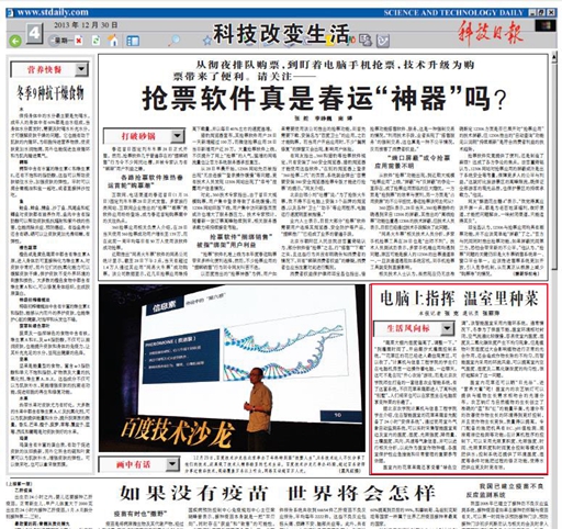 “蔬菜大棚內濕度偏高了,調整一下。”“到灌溉時間了,開啟潮汐式灌溉控制系統。”“花草區的花已經進入最佳觀賞區,可以收了。”計算機與信息工程學院的學生們在電腦機房里一邊操作著電腦,一邊聊天。這可不是在玩“開心農場”游戲,而是北京農學院師生打造的一套信息農業智能系統,有了這套系統,不僅花草果蔬都進入了高科技“別墅”,人們將來也可以在家里坐在電腦前享受種菜的樂趣了。