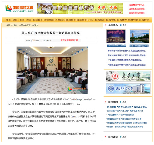 4月8日,英國哈珀·亞當斯大學校長大衛·盧埃林教授(Prof. David George Llewellyn)一行三人訪問北京農學院。校長王慧敏親切會見了哈珀·亞當斯大學校長一行。