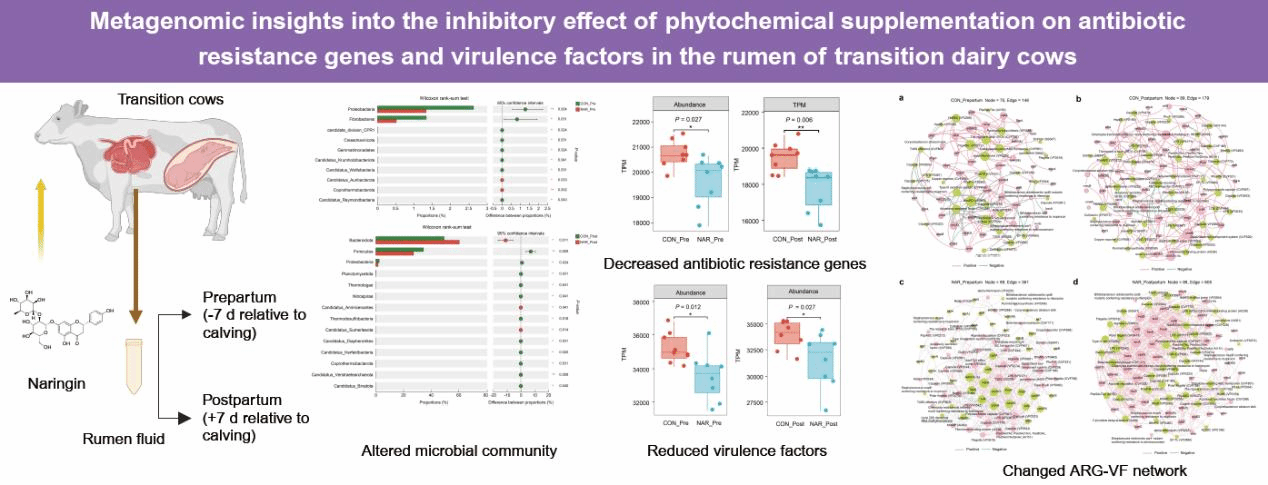 研究團隊選取36頭圍產期荷斯坦奶牛,將其分為對照組(基礎日糧)和柚皮苷組(基礎日糧中添加30 g/d柚皮苷)。通過宏基因組測序技術,分析兩組奶牛瘤胃液中微生物群落結構、抗性基因和毒力因子在圍產期的動態變化,并結合生物信息學方法評估柚皮苷對耐藥基因網絡的影響。
