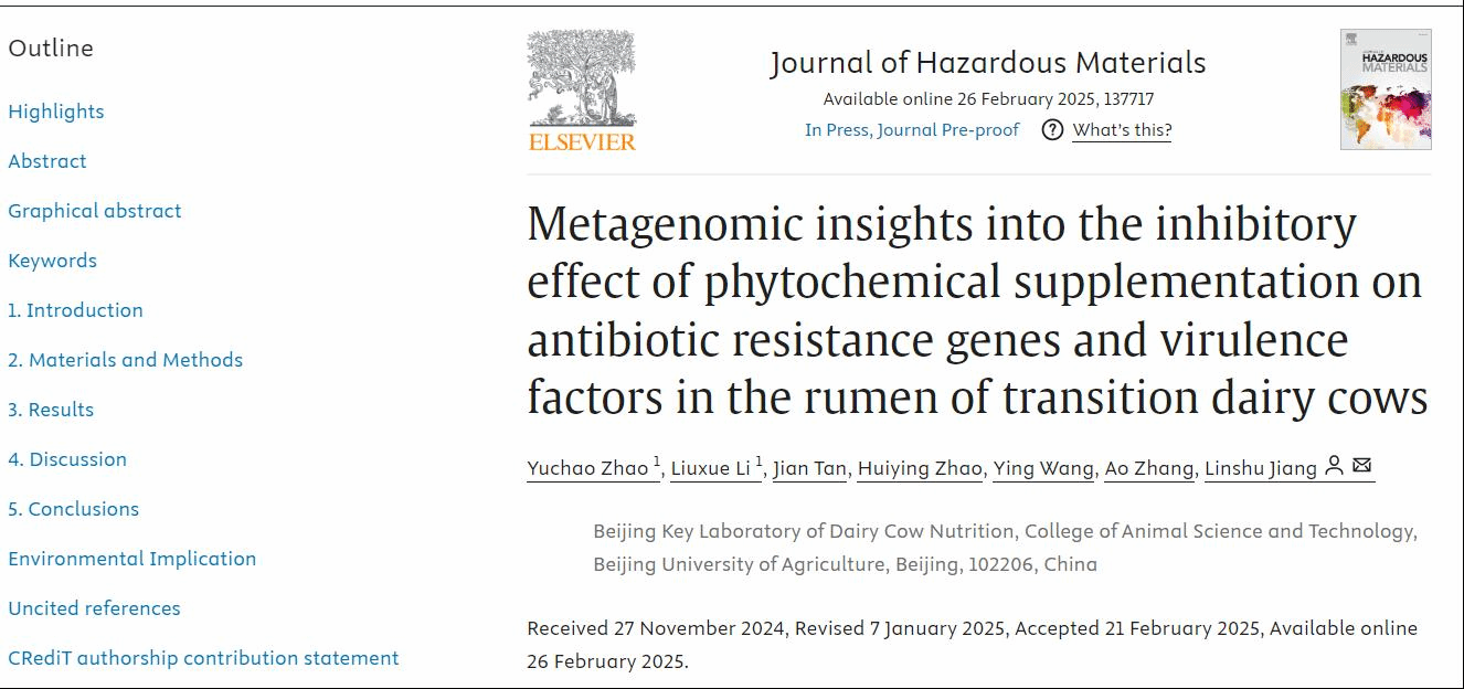 近日,我校蔣林樹教授團隊在國際學術期刊《危險材料雜志》(Journal of Hazardous Materials,中科院1區Top期刊,影響因子12.2)在線發表了題為《植物活性物質添加劑對圍產期奶牛瘤胃抗生素抗性基因和毒力因子抑制作用的宏基因組學研究》(Metagenomic insights into the inhibitory effect of phytochemical supplementation on antibiotic resistance genes and virulence factors in the rumen of transition dairy cows)的研究性論文。該研究以圍產期奶牛為研究模型探究了飼糧中添加柚皮苷對瘤胃抗性基因和毒力因子的影響與機制,為開發植物源飼料添加劑改善瘤胃功能、減少抗性基因和毒力因子向環境的擴散提供了理論基礎。動物科學技術學院趙玉超副教授和已畢業研究生李留學(現為南京農業大學博士研究生)為論文的共同第一作者,蔣林樹為論文的通訊作者。該研究獲得了國家自然科學基金項目和北京市自然科學基金的資助。