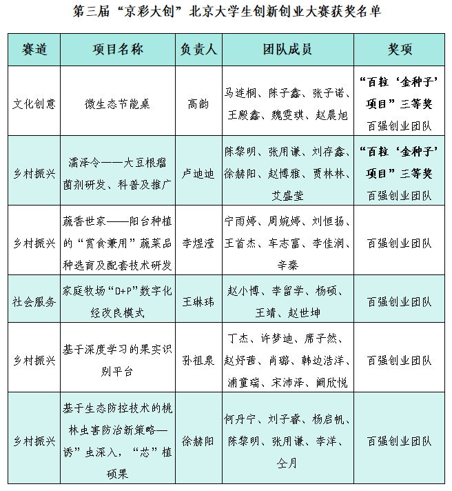 近日,北京市教育委員會(huì)、北京市人力資源和社會(huì)保障局、北京市發(fā)展和改革委員會(huì)聯(lián)合公布了第三屆“京彩大創(chuàng)”北京大學(xué)生創(chuàng)新創(chuàng)業(yè)大賽獲獎(jiǎng)名單,我校6支學(xué)生團(tuán)隊(duì)榮獲北京市“百?gòu)?qiáng)創(chuàng)業(yè)團(tuán)隊(duì)”稱號(hào),其中“微生態(tài)節(jié)能桌”“濡澤令——大豆根瘤菌劑研發(fā)、科普及推廣”2支團(tuán)隊(duì)晉級(jí)決賽并獲得三等獎(jiǎng),被列為北京大學(xué)生創(chuàng)新創(chuàng)業(yè)“百粒‘金種子’項(xiàng)目”,學(xué)校榮獲優(yōu)秀組織獎(jiǎng)。