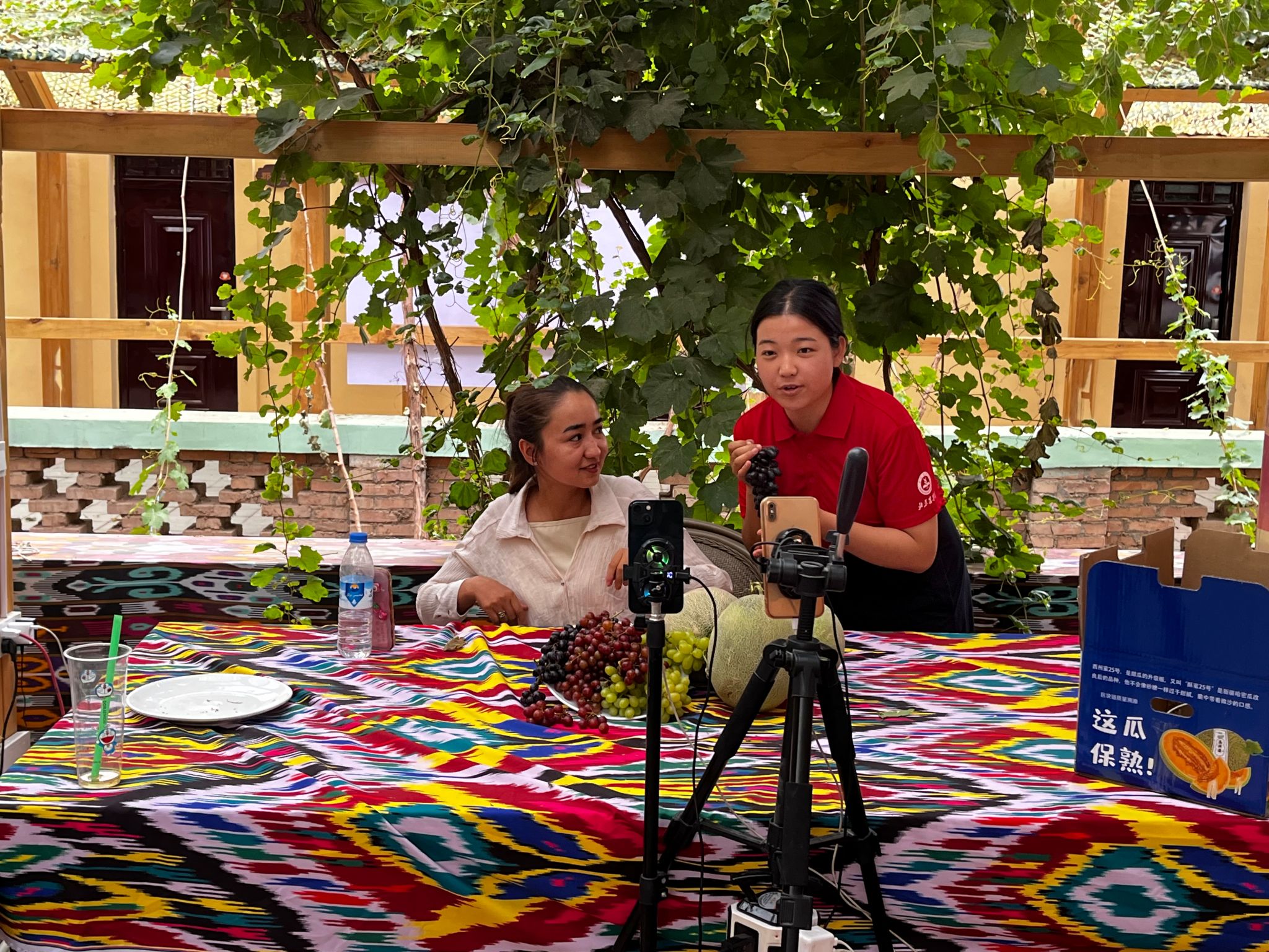 葡萄產(chǎn)業(yè)是吐魯番地區(qū)的富民產(chǎn)業(yè),是鄉(xiāng)親們口中的“甜蜜事業(yè)”,是當(dāng)?shù)赝苿?dòng)文化和旅游深度融合的紐帶和“金名片”。實(shí)踐團(tuán)參與到2023年吐魯番葡萄采摘季開(kāi)園儀式中,幫助當(dāng)?shù)毓r(nóng)組織葡萄采摘派對(duì)、搭建舞臺(tái)、布置場(chǎng)地、向游客介紹葡萄品種。實(shí)踐團(tuán)成員還走進(jìn)葡萄售賣(mài)直播間化身“帶貨主播”,以實(shí)際行動(dòng)助力村民增收和葡萄產(chǎn)業(yè)發(fā)展。