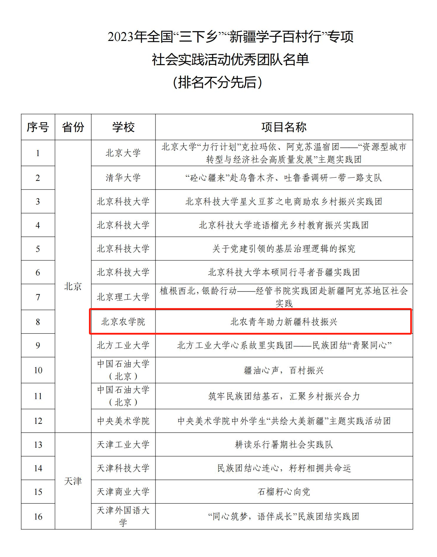 11月1日,共青團(tuán)新疆維吾爾自治區(qū)委公布了2023年全國(guó)“三下鄉(xiāng)”“新疆學(xué)子百村行”專(zhuān)項(xiàng)社會(huì)實(shí)踐活動(dòng)優(yōu)秀團(tuán)隊(duì)名單,我校生物與資源環(huán)境學(xué)院“北農(nóng)青年助力新疆科技振興”實(shí)踐團(tuán)從全國(guó)127所高校的230支隊(duì)伍中脫穎而出,獲評(píng)優(yōu)秀團(tuán)隊(duì)。