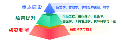學校實施“重點建設—培育提升—動態新增”學科分層分類建設。重點建設學科聚焦園藝學、畜牧學、農林經濟管理、林學,實施優先投入與成果培育;培育提升學科緊扣“新農科”“新工科”交叉趨勢,以生物工程、植物保護、作物學、獸醫學、工商管理學、食品科學與工程為核心,強化特色定位與競爭力;動態新增學科以智能科學與技術為代表,跟蹤“人工智能”“雙碳”“鄉村治理現代化”等前沿領域,建立“需求牽引—動態評估—滾動培育”機制。