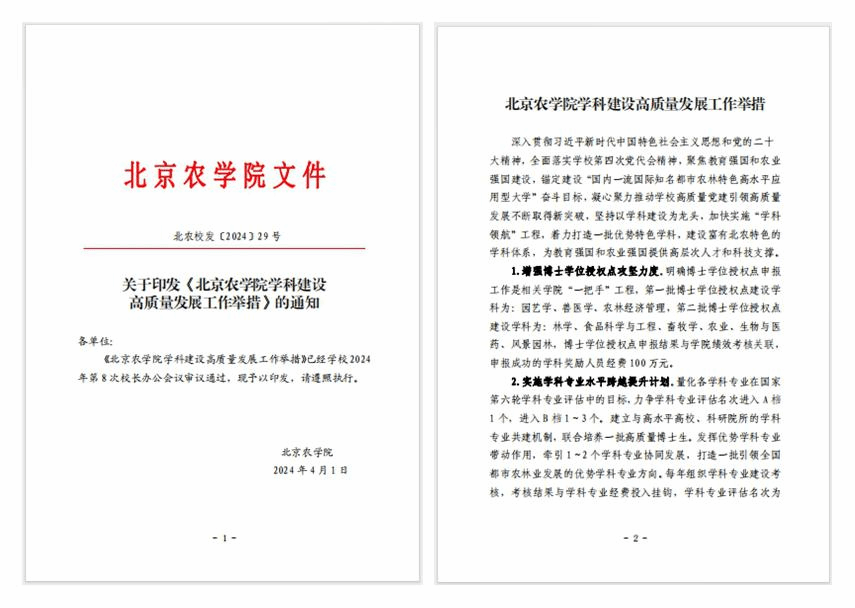 制定《學科建設高質量發展工作舉措》,著力打造一批優勢特色學科。推進都市農林學交叉學科平臺建設,完成年度各項績效指標與建設任務,順利通過北京市教委2024年都市農林學交叉學科平臺評估,不斷提升平臺成果產出和影響力。持續推進學科交叉融合,“園藝+食品+智能”助力凈菜產業發展,“畜牧+食品+智能”助力畜牧產業發展,“農經+食品+園林”助力食品產業發展,“農經+畜牧+生態”構建交叉融合特色智庫。申報2024年研究生教育分類發展項目,獲批600萬元支持。強化專業內涵發展,動態調整專業設置,新增2個新農科引導性專業,加快推進本科專業認證工作,加大對國家級和北京市級一流本科專業的建設力度。