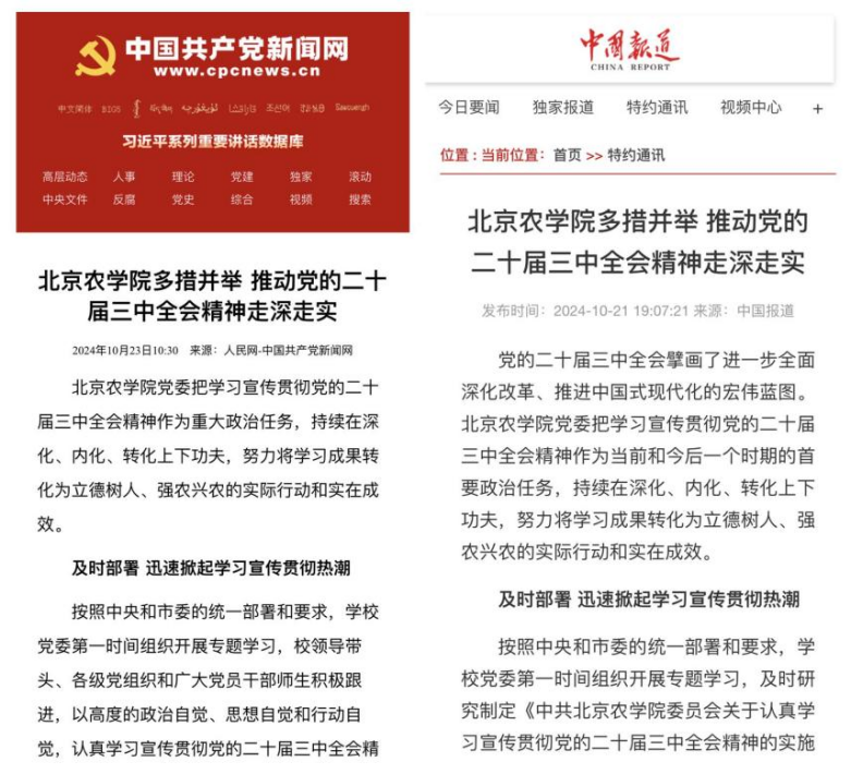 及時跟進學習習近平總書記系列重要講話和重要指示批示精神,深入學習宣傳貫徹黨的二十屆三中全會精神,嚴格落實黨委常委會“第一議題”制度和黨委理論學習中心組學習制度,人民網、中國報道等多家媒體對學校《多措并舉推動黨的二十屆三中全會精神走深走實》進行報道。以改革創新精神全力推動學校高質量黨建引領高質量發展不斷邁上新臺階、取得新進展。學校績效考核和領導班子考核結果均為“優秀”。北京市委常委、教育工委書記于英杰,北京市政府黨組成員、副市長馬駿,市級老同志到我校調研,對學校高質量黨建引領高質量發展、科技賦能鄉村振興取得的成績給予充分肯定。