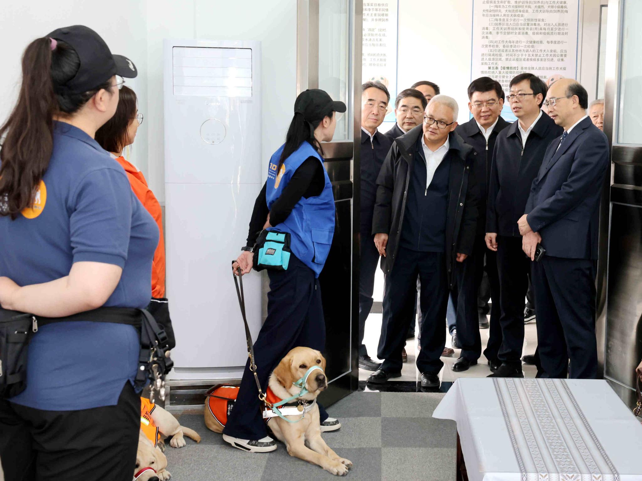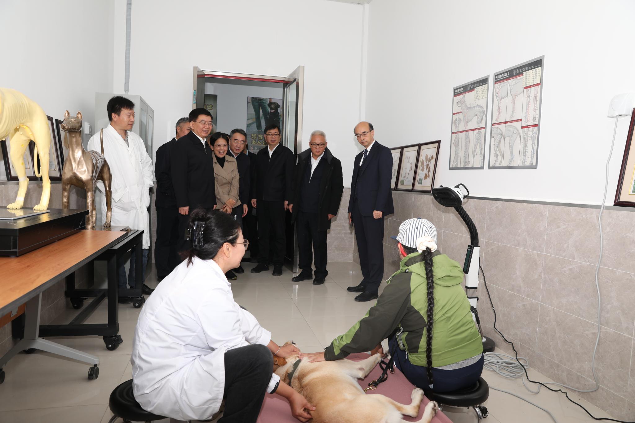 座談會前,馬駿實地調研了導盲犬培訓示范中心,察看了犬舍、中獸醫診療室、診斷處置室以及訓練場等,觀看了導盲犬工作展示,深入了解導盲犬日常養護、訓練,基地建設、運行情況,并對學校發揮學科專業優勢推動北京市導盲犬培訓基地建設取得的進展給予充分肯定。市殘聯黨組書記、理事長陸曉光,昌平區委副書記、區長支現偉,副區長馬春秀等領導一同調研。