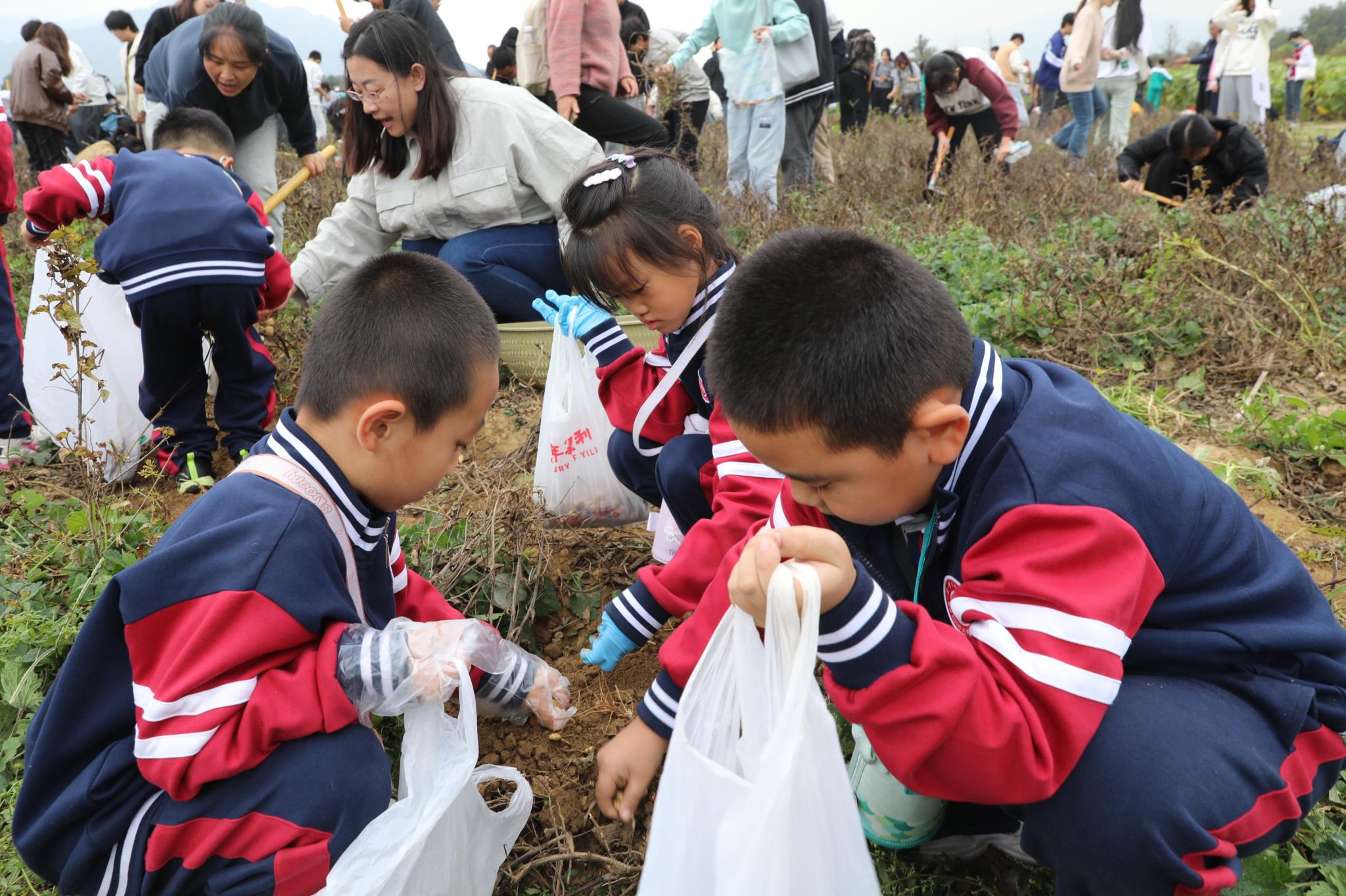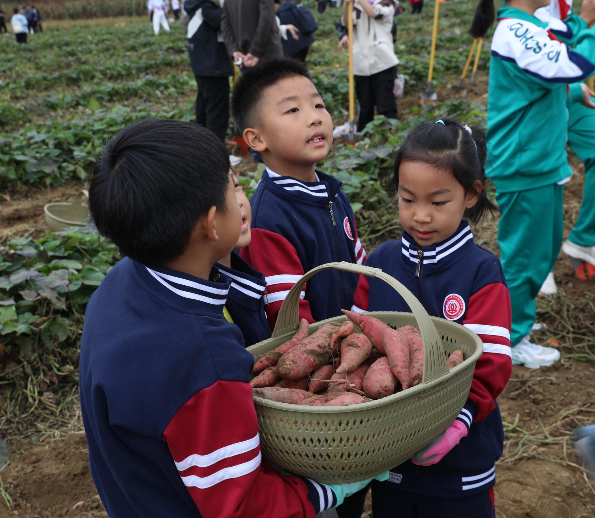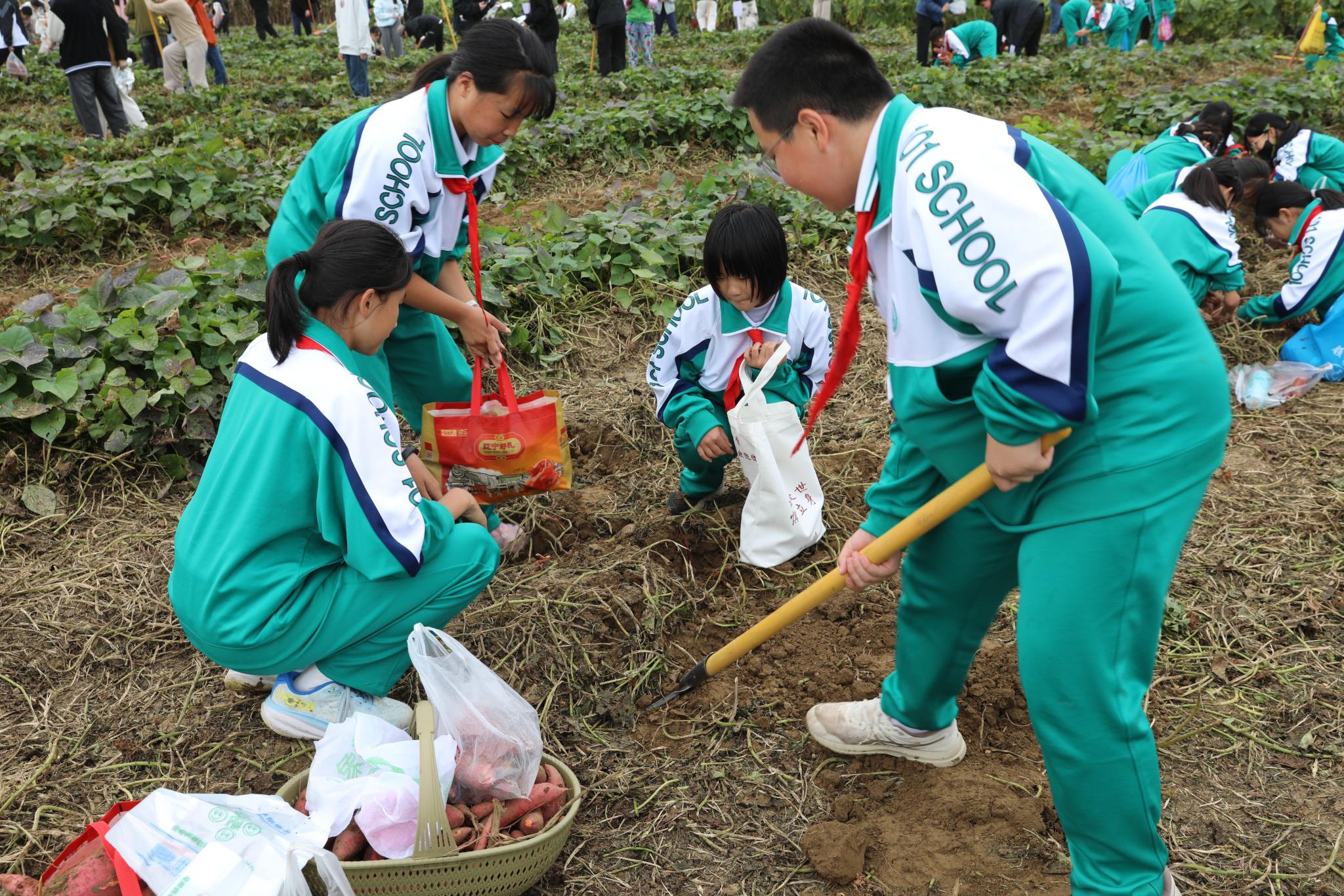 來自北京一零一中學昌平實驗學校的中小學生在北京農學院學生的指導下體驗秋收農事活動。小學一年級的陳浥塵舉著自己挖到的一大兜花生高興地說:“以前在姥姥家挖過土豆,跟今天的體驗完全不一樣,太有意思啦!”初中一年級的陳宇桐說:“沒想到采收紅薯和花生還有這么多的學問,我們不僅學習到了課本以外的知識,還體驗到了勞動的快樂,理解了勞動的價值與意義,今后將更加珍惜糧食,熱愛勞動?!?/p>