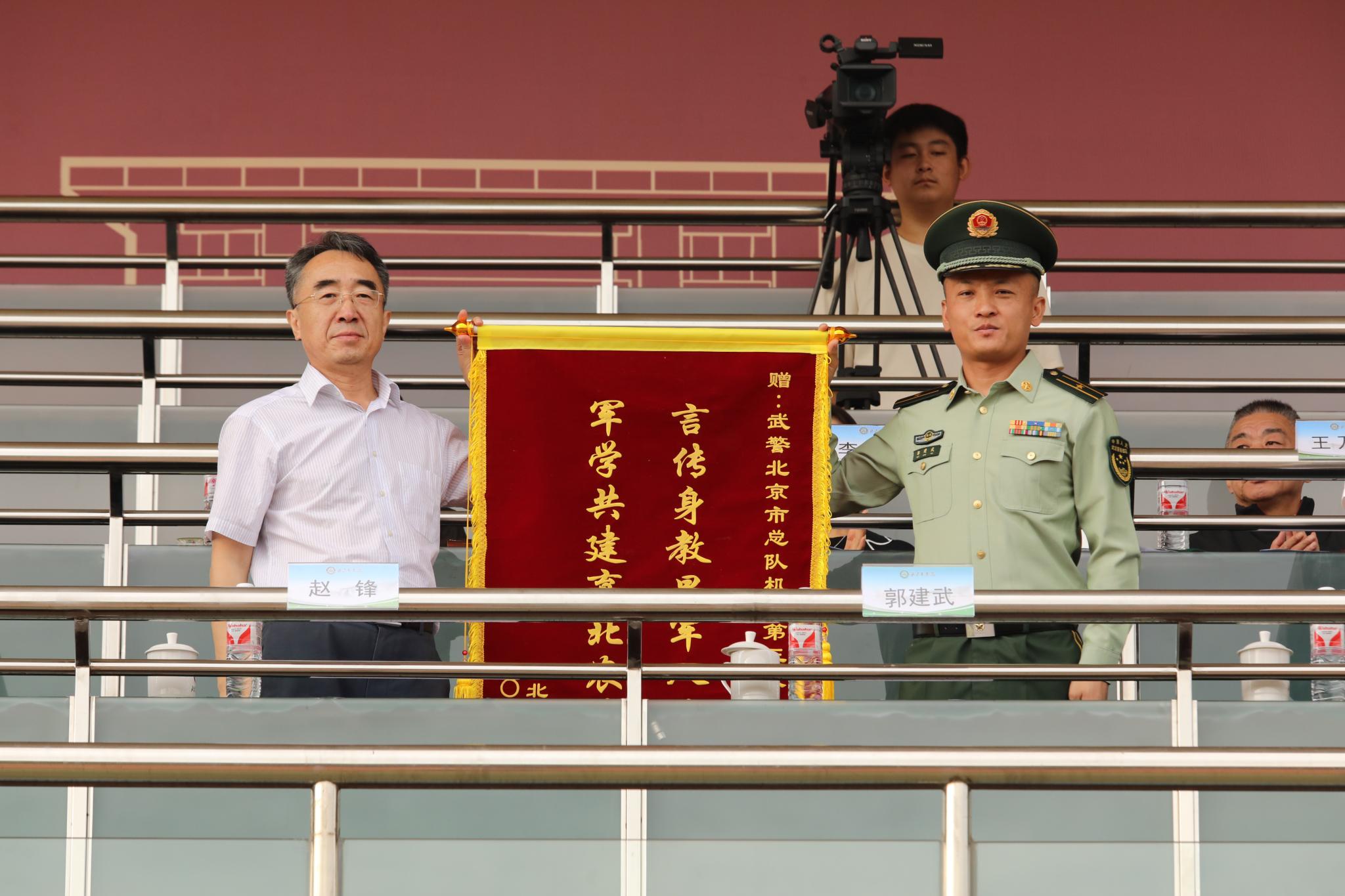 趙鋒代表學校向承訓單位贈送錦旗并表示衷心感謝,希望以此次軍訓為契機,雙方進一步加強交流合作,共同為培養可堪大用能擔重任的棟梁之才作出更大貢獻。