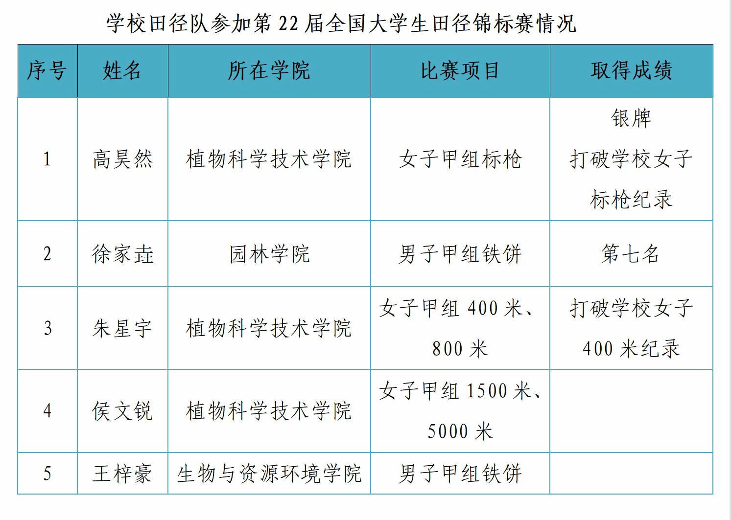 近日,第22屆全國大學生田徑錦標賽在福建南平舉行,共有來自全國30個省、自治區、直轄市的438所院校5285名運動員及教練員參與本次賽事,參賽單位數量與運動員規模均創歷屆新高。我校田徑隊在體育教學部劉軍占、逯合江兩位老師的帶領下,分別斬獲女子甲組標槍銀牌、男子甲組鐵餅第七名的好成績。