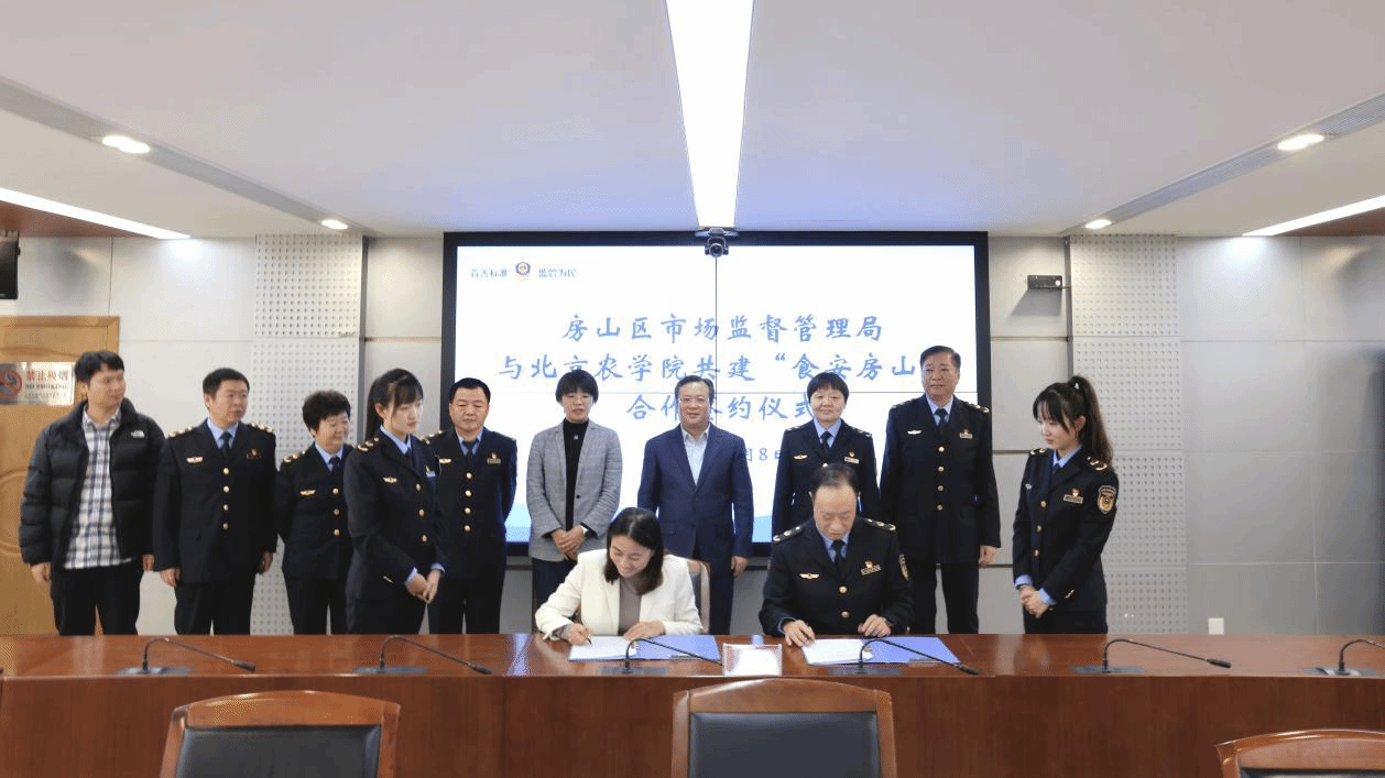 11月8日,學(xué)校與房山區(qū)市場監(jiān)督管理局簽訂共建“食安房山”合作協(xié)議。我校黨委常委、紀(jì)委書記吳君楚,房山區(qū)市場監(jiān)督管理局黨組書記、局長李軍出席簽約儀式。