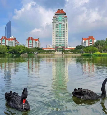 望著波光粼粼的芙蓉湖,湖邊綠意盎然。記得教A和教B之間的竹林同樣高聳挺拔、生機勃勃,在這里一邊聆聽鳥叫蟲鳴,一邊靜靜品讀,會發現原來讀書是這么愜意。