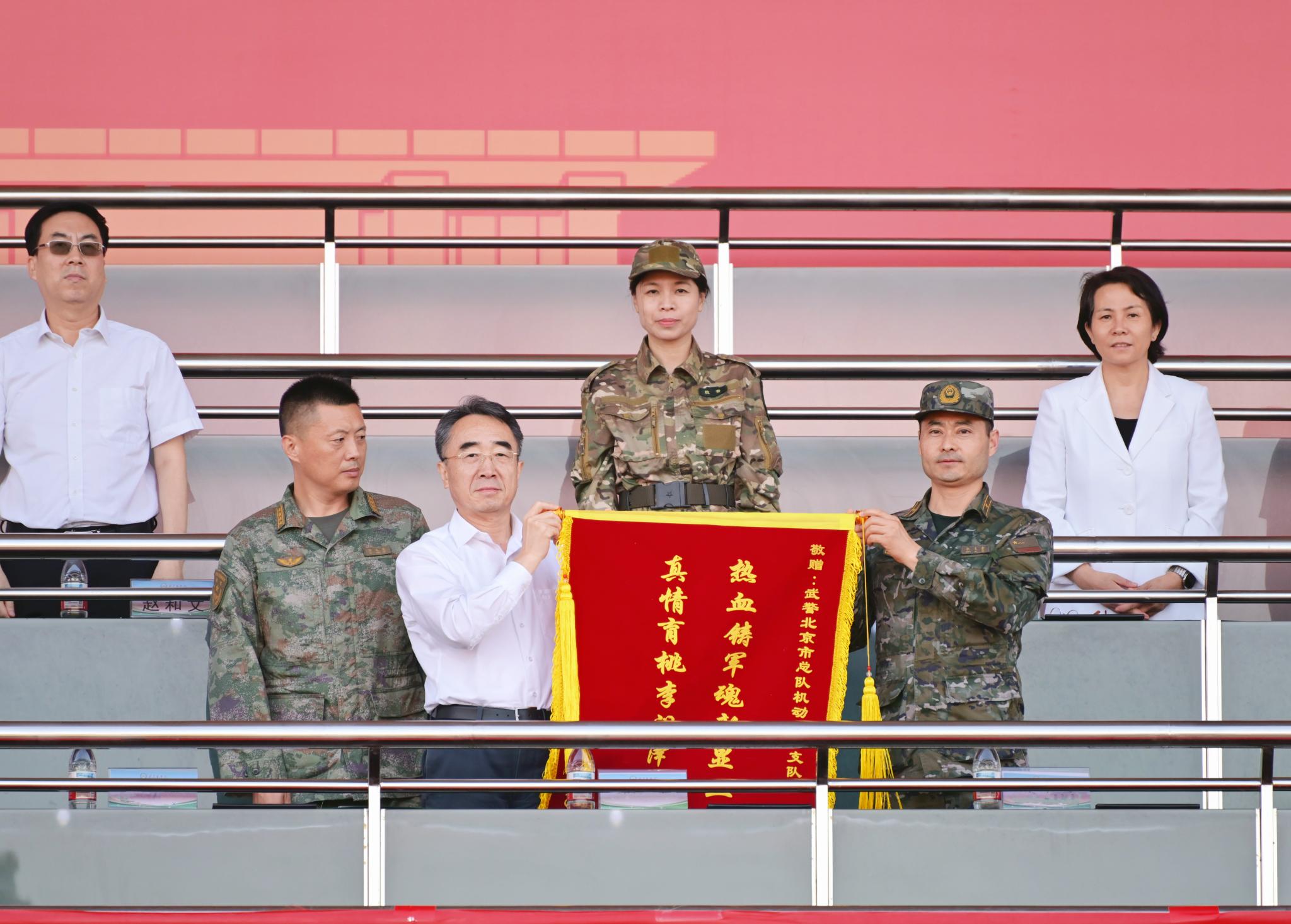 黨委書記趙鋒代表學校向承訓部隊贈送錦旗,感謝承訓部隊對學校軍訓工作的大力支持。