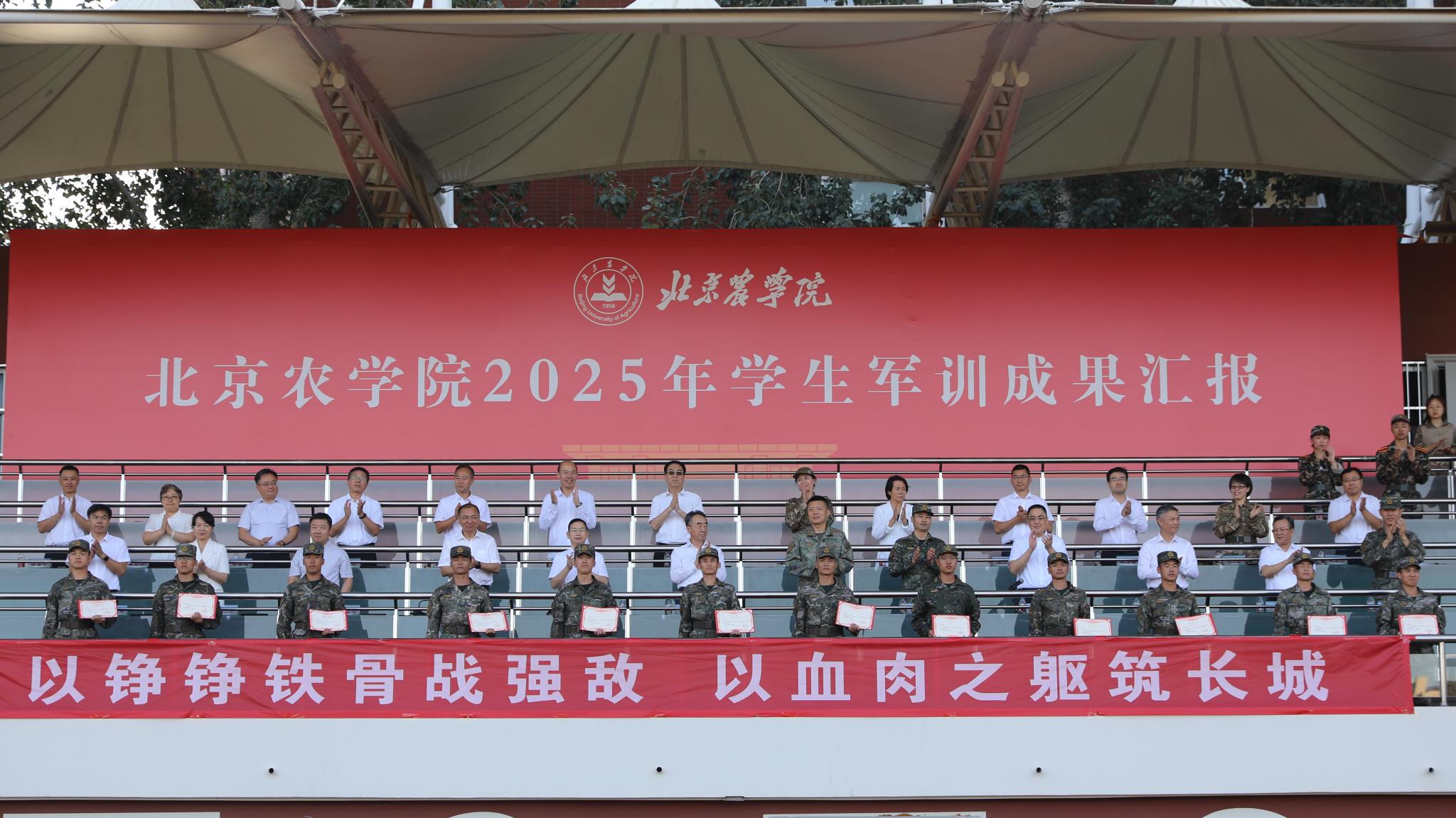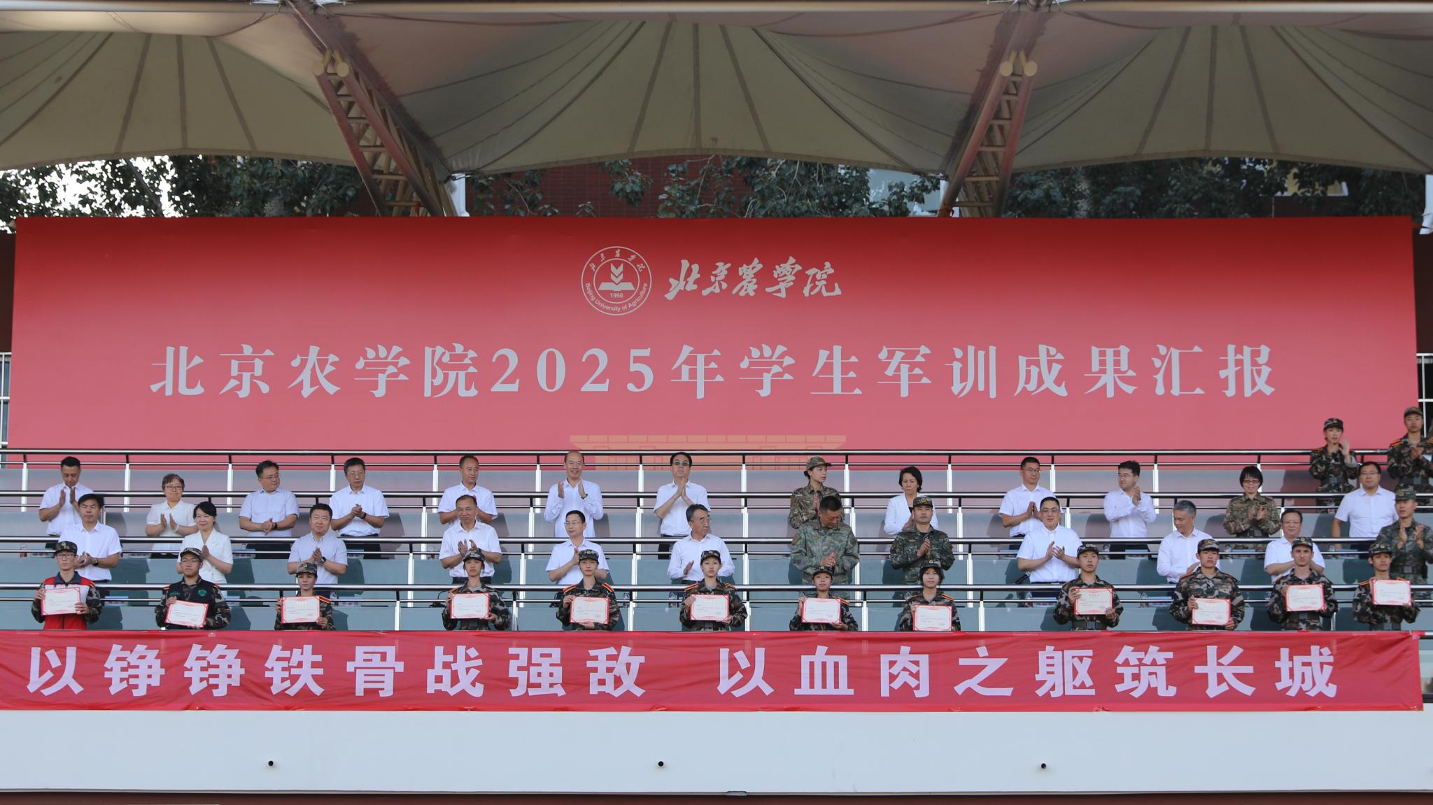 黨委副書記仲叢生宣讀了《北京農學院2025年學生軍訓優秀個人表彰決定》。與會領導為優秀指導員、助理、服務保障人員代表、優秀學生代表和優秀教官代表頒發了榮譽證書。