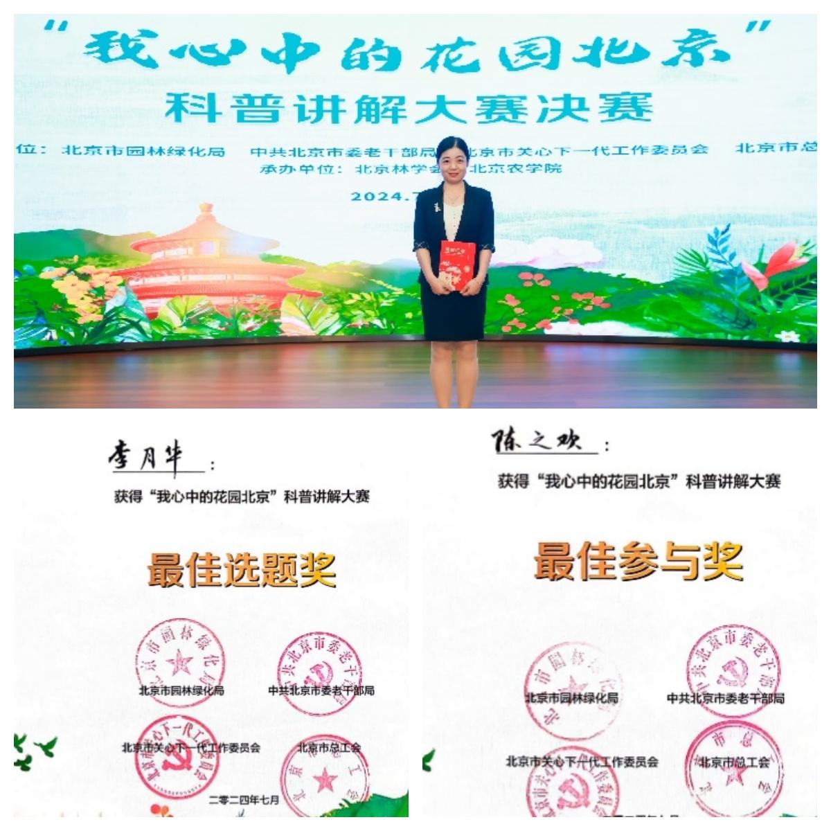 經過激烈角逐,我校園林學院多位師生獲獎。其中,馮麗副教授獲得非專職組三等獎,李月華老師獲得最佳選題獎、最佳參與獎,退休教師陳之歡獲得最佳參與獎,張慧穎同學進入復賽。我校師生在比賽中展現出較高的專業素養,為傳播園林科學與文化知識,宣傳北京花園城市建設作出積極貢獻。
