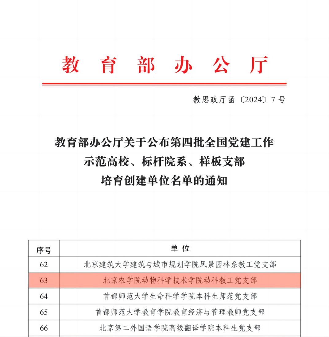 近日,教育部辦公廳正式印發《關于公布第四批全國黨建工作示范高校、標桿院系、樣板支部培育創建單位名單的通知》(教思政廳函〔2024〕7號),我校動物科學技術學院動物科學教工黨支部獲批“全國黨建工作樣板支部”培育創建單位。這是學校基層黨建工作取得的又一項重要成績,本次入選支部由校級黨建“雙創”項目培育產生。