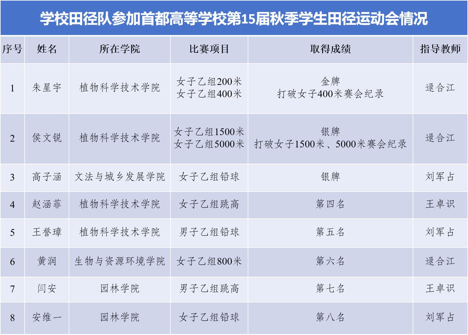 據(jù)悉,首都高等學(xué)校學(xué)生田徑運(yùn)動(dòng)會(huì)是北京市大學(xué)生每年一屆的綜合性賽事,也是全國(guó)規(guī)模最大、水平最高的省級(jí)學(xué)生田徑運(yùn)動(dòng)會(huì)。在我校帶隊(duì)教師的悉心指導(dǎo)下,參賽運(yùn)動(dòng)員頑強(qiáng)拼搏、奮勇?tīng)?zhēng)先,在多個(gè)項(xiàng)目中取得了優(yōu)異成績(jī)。體育教學(xué)部逯合江老師指導(dǎo)的朱星宇同學(xué)獲得女子乙組200米第一名、400米兩項(xiàng)冠軍,并打破女子400米賽會(huì)紀(jì)錄;侯文銳同學(xué)獲得女子乙組1500米、5000米兩項(xiàng)亞軍,并分別打破女子1500米、5000米賽會(huì)紀(jì)錄;黃潤(rùn)獲得女子乙組800米第六名。劉軍占副教授指導(dǎo)的高子涵同學(xué)獲得女子乙組鉛球亞軍,安維一同學(xué)獲得女子乙組鉛球第八名,王譽(yù)璋同學(xué)獲得男子乙組鉛球第五名。王卓識(shí)副教授指導(dǎo)的趙涵菲同學(xué)獲得女子乙組跳高第四名,閆安同學(xué)獲得男子乙組跳高第七名。