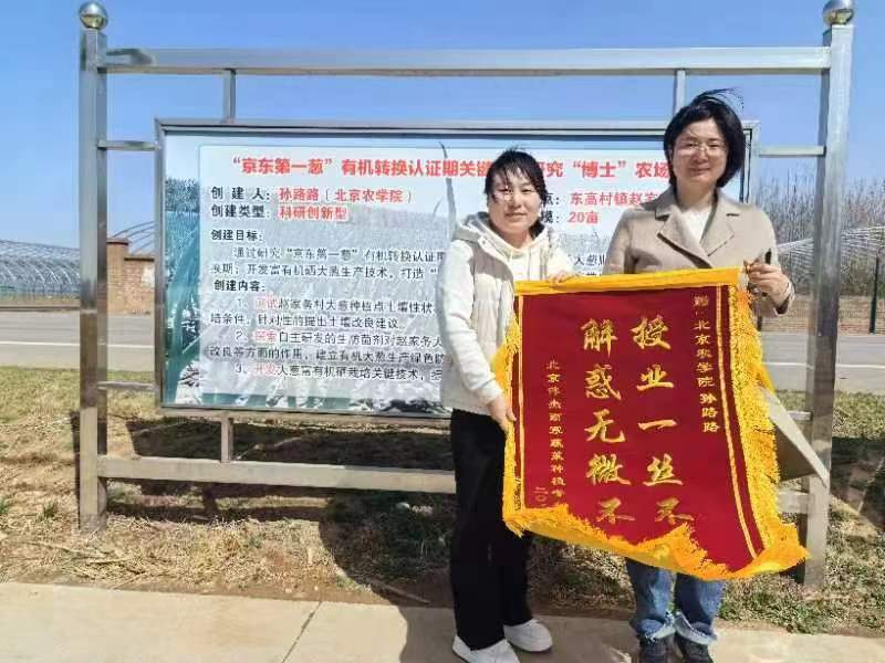 在東高村鎮大蔥博士農場,大家實地調研了大蔥育苗情況和基地早春蔬菜生產情況。老師們對早春大蔥苗和目前基地種植的花菜、甘藍、水果洋蔥等前茬蔬菜的管理提出管理措施。大家還一起深入討論了大蔥四季供應策略的問題。該村北京偉杰雨寒蔬菜專業種植合作社社長張國偉還為孫路路送上了錦旗,“感謝孫老師過去兩年對合作社各方面的幫助和支持,讓我們嘗到了科技興農的甜頭。”