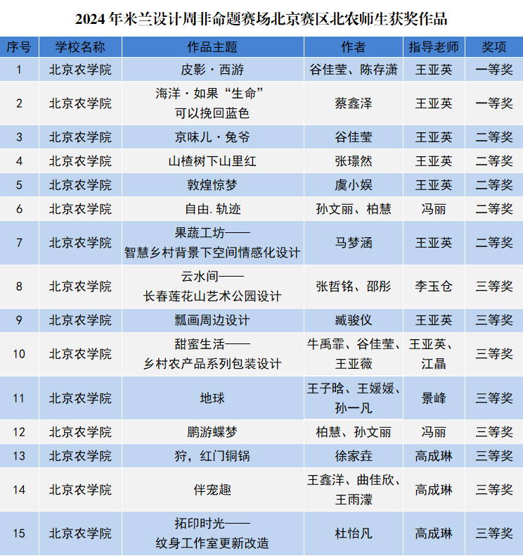 近日,2024年“米蘭設計周-中國高校設計學科師生優秀作品展”非命題賽場北京賽區獲獎名單公布,我校園林學院師生作品獲一等獎2項、二等獎5項、三等獎8項。北京賽區獲獎作品將繼續進入全國總決賽評審。